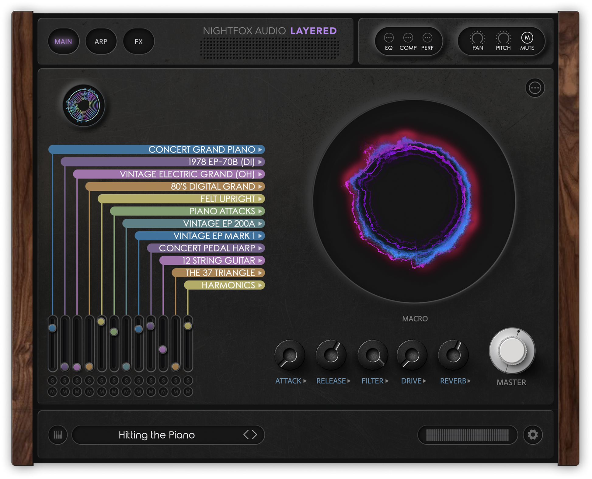 A stack of 12 sounds, mixed together to create brand new, hybrid tones. Choose your instruments, pan and EQ each, add a powerful arpeggiator and a full range of dynamic effects. The presets are incredibly inspiring and you can make them your own with a few quick clicks.